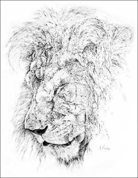 is a black and white pencil sketch depicting a sleeping lion.