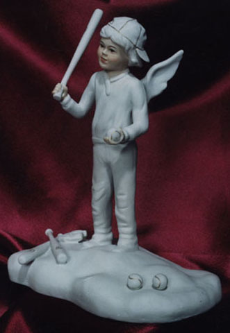 Takin' Infield depicts a boy playing baseball; it is the first angel figurine in the Caleb Series.