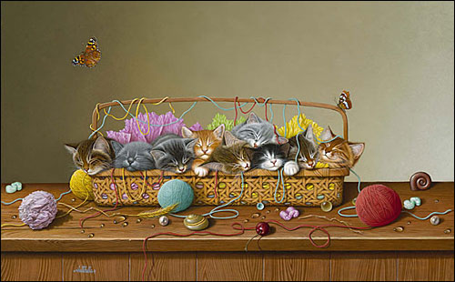 | This litter of nine lives is sleeping off a busy day spent gathering and assembling their own version of kitty litter. Painted to perfection by our fabled fashioner of felines, Braldt Bralds, you'll find among the colorful tissue and leftover packing peanuts an assortment of other items purr-loined from his previous puss paintings including tissue from Bag Ladies, pearls from Boucat and packing peanuts from Siamese Twins. |