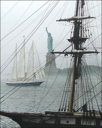 The ships shown in this painting sailed past Liberty in 2000. Many Tall Ships gathered around her at her 100th