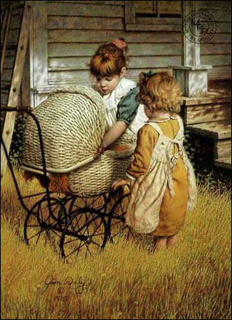 in earlier days. The baby buggy in this painting is from the past; it continues to be cherished by a