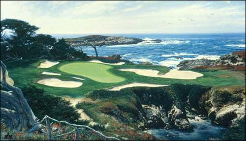 depicts the fifteenth hole at Cypress Point Golf Course.
