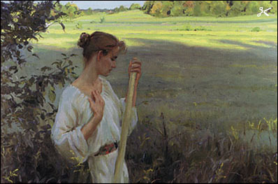 In this view, the early morning light gently caresses the distant woodland as the girl