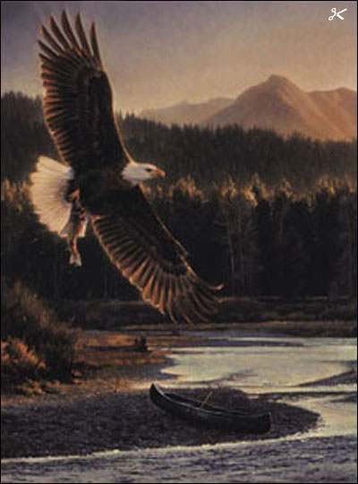 depicts a majectic bald eagle soaring early in the morning in search of a breakfast meal.