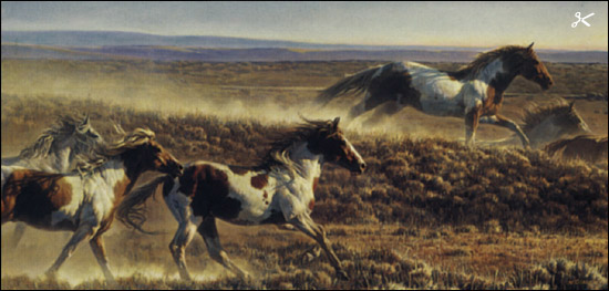 Wild mustangs thunder over rugged terrain in Nancy Glazier's Unbridled Spirit. They are