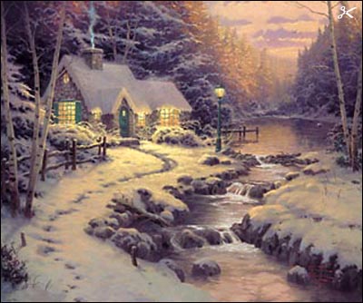 The stream, not yet frozen for skating, murmurs its echo of the holiday cheer