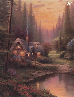 setting. Dusk has fallen, a small wisp of smoke rises from the chimney of this quaint