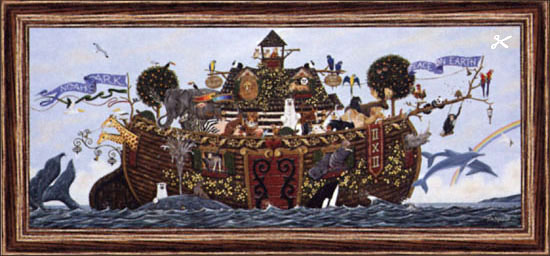 Two by two, inside the Ark, with Noah and his wife.
