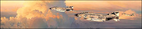 "Flying through storm-tossed skies, Phantoms of VF-96, the Flying Falcons, return from a strike over North Vietnam,"
