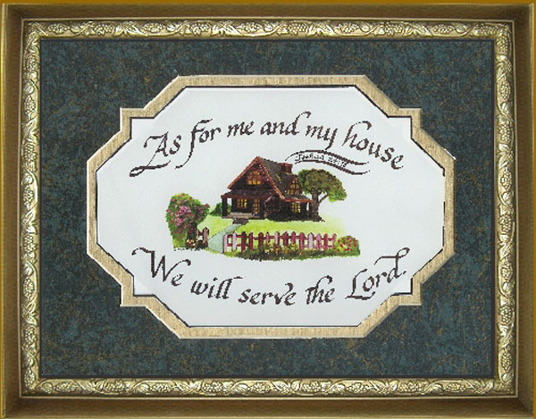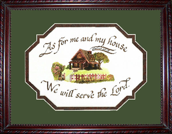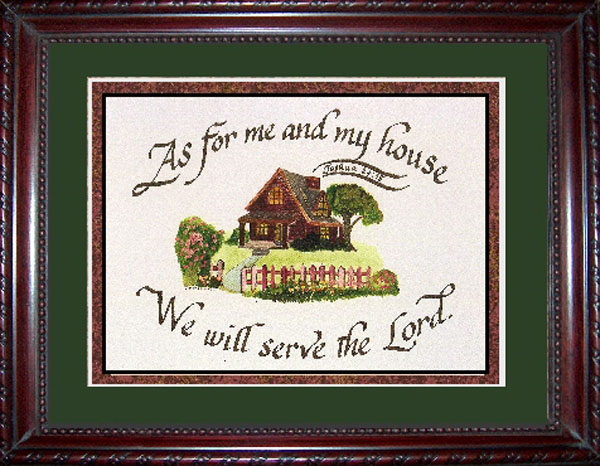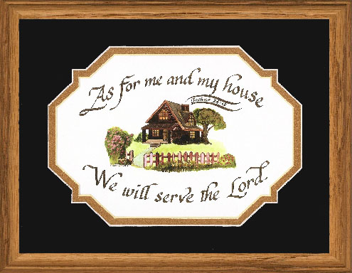 The artist has illustrated this text with a red brick home, flowers, and picket fence. The scripture verse is creatively coming out of the chimney. This piece is a beautiful acknowledgment to all that your home puts the Lord first and He is the center point to family.