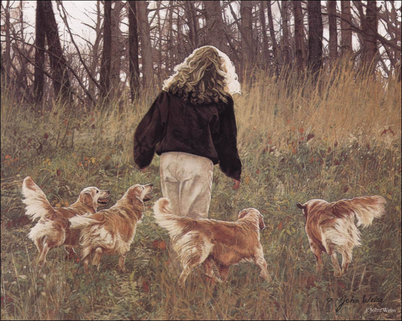 A quiet walk across a grassy field and into the woods, you, your dogs, and a crisp day in fall.